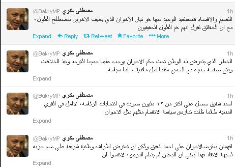 ونوه بكري إلى أن سياسة التقسيم والاقصاء المستفيد الوحيد منها الاخوان والذين وصفهم بالفلول الحقيقيون – بحسب قوله – وقال" لا أمل في القوى المدنية طالما ظلت تمارس سياسة الانقسام مثلهم مثل الإخوان، فالخطر الذي يتعرض له الوطن تحت حكم الإخوان يوجب علينا جميعا التوحد ونبذ الخلافات وفتح صفحة جديدة مع الجميع مثلما فعل مانديلا. أما سياسة التقسيم والإقصاء فالمستفيد الوحيد منها هو تيار الإخوان الذي يخيف الآخرين بمصطلح الفلول. مع أن الحقائق تقول أنهم هم الفلول الحقيقيون"