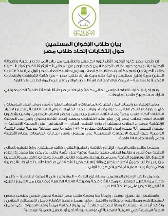 وتابعوا قائلين :" استشعاراً منا بضيق الوقت ، وإيماناً منا بحاجة طلاب مصر الملحة لممثل شرعي منتخب ينهض لمشكلاتهم ومطالبهم بالكفاءة والاقتدار ، فإننا نسجل رفضنا القاطع تأجيل الاستحقاق الطلابي ، ونؤكد أن إجراء الانتخابات وفقاً لنصوص اللائحة أمر ملزم للكافة ومبدأ واجب الاحترام ، فضلا عن أننا  نحمل اللجنة المشرفة علي العملية الانتخابية أي عواقب نتيجة تأخير أو تعطيل العملية الانتخابية" .