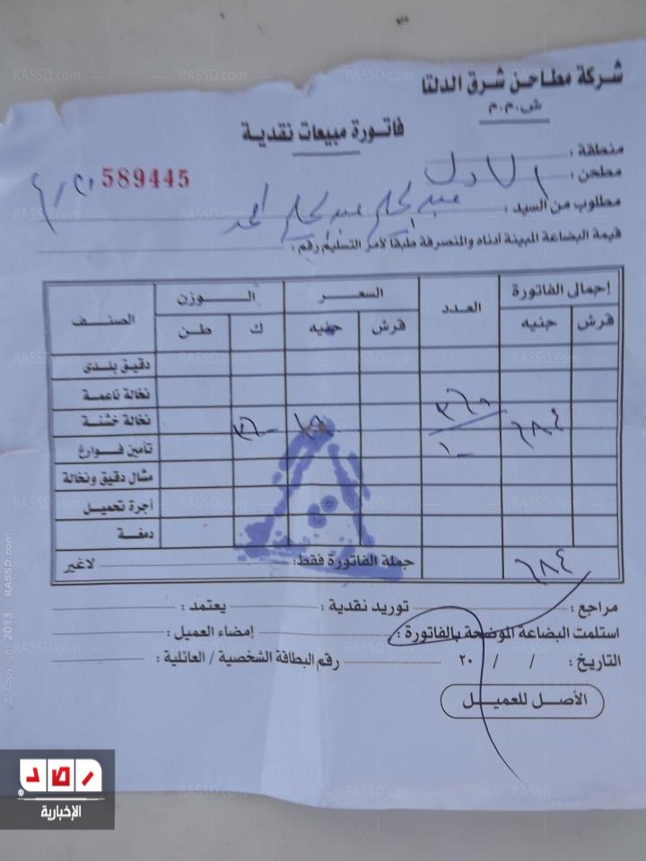 حصلت شبكة رصد الإخبارية على أول مخالفة لشركة مطاحن شرق الدلتا بمحافظة الدقهلية والتي تفيد بيعها  لطن (الردة) بـ 1900جنيه بدلا من 1550 جنيه و هو السعر الذي حددته وزارة التموين لطن الردة.
