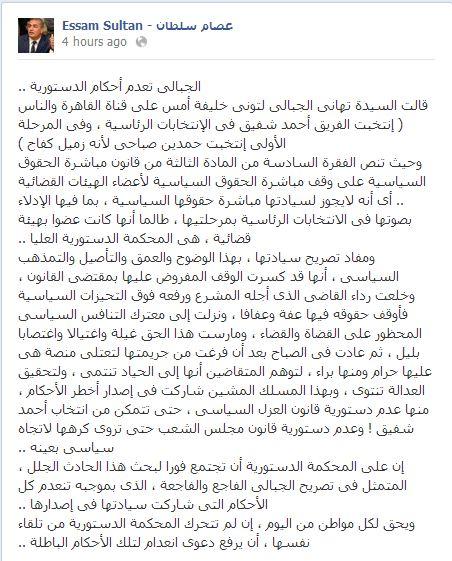 ونبه"سلطان" أن" الجبالي" :"مارست هذا الحق غيلة واغتيالا ثم عادت في الصباح بعد أن فرغت من جريمتها لتعتلى منصة هي عليها حرام ومنها براء ، لتوهم المتقاضين أنها إلى الحياد تنتمي ، ولتحقيق العدالة تنتوى ، وبهذا المسلك المشين شاركت في إصدار أخطر الأحكام ، منها عدم دستورية قانون العزل السياسي ، حتى تتمكن من انتخاب أحمد شفيق ، وعدم دستورية قانون مجلس الشعب حتى تروى كرهها لاتجاه سياسي بعينه " .