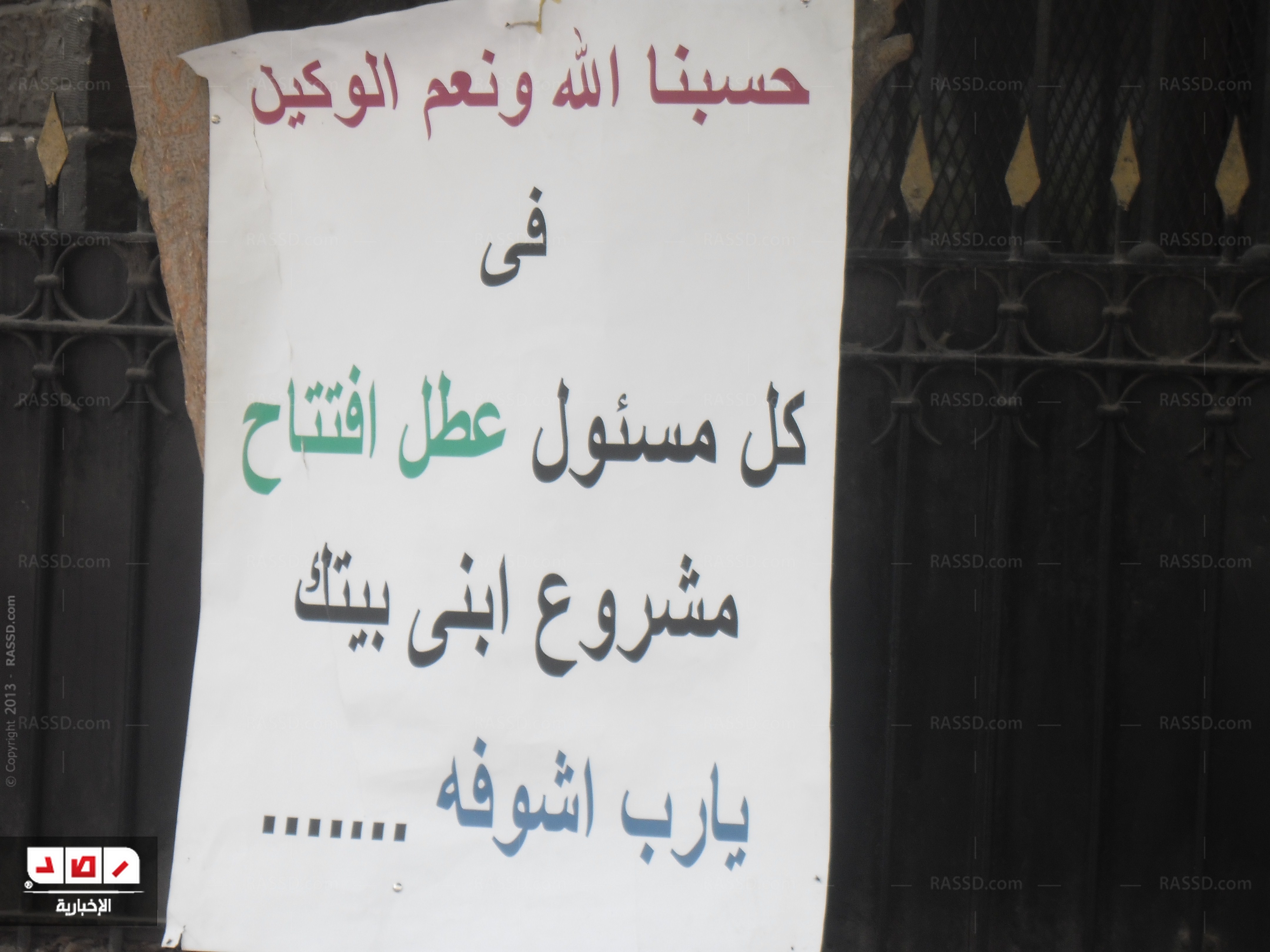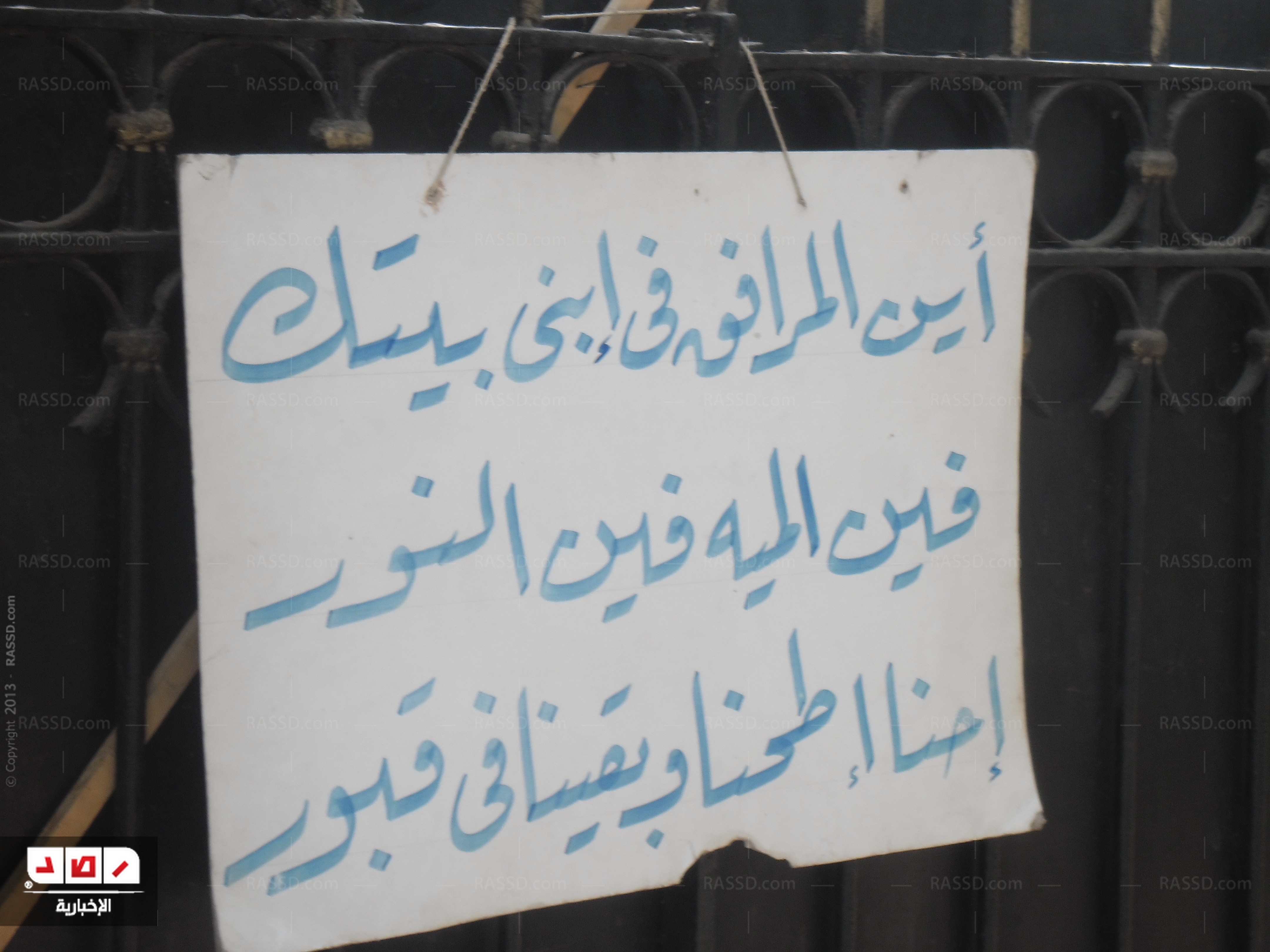 ويطالب المعتصمون بإدخال المرافق لمباني المشروع، كما رفع المعتصمون لافتات كتب عليها "البنية التحتية " بكل لغات العالم وأخرى أين المرافق في ابني بيتك..فين الميه فين النور إحنا اطحنا وبقينا في القبور .