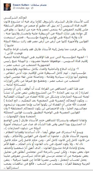 وأضاف سلطان في تدوينه له على موقع الفيسبوك اليوم(الثلاثاء) أن وزارات الدفاع والداخلية والعدل بكامل سلطاتهم وقوانينهم و مؤسساتهم ، لهم كامل السيطرة على الإقليم دون أدنى انتقاص ، ومعلوم أنها وزارات سيادية وهامة ، وحاصلة على ثقة مجلس النواب المنتخب من شعب مصر، وتخضع مع غيرها من باقي الوزارات للمساءلة أمامه.
