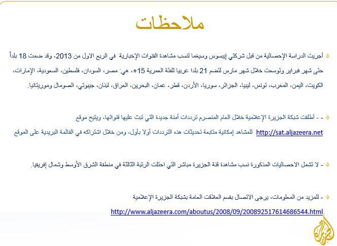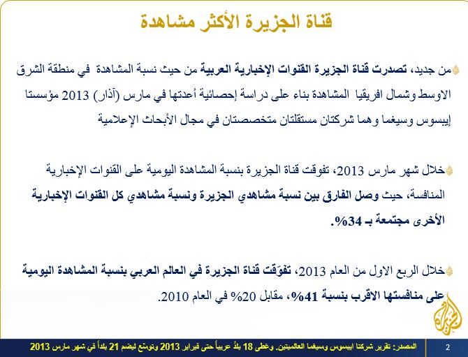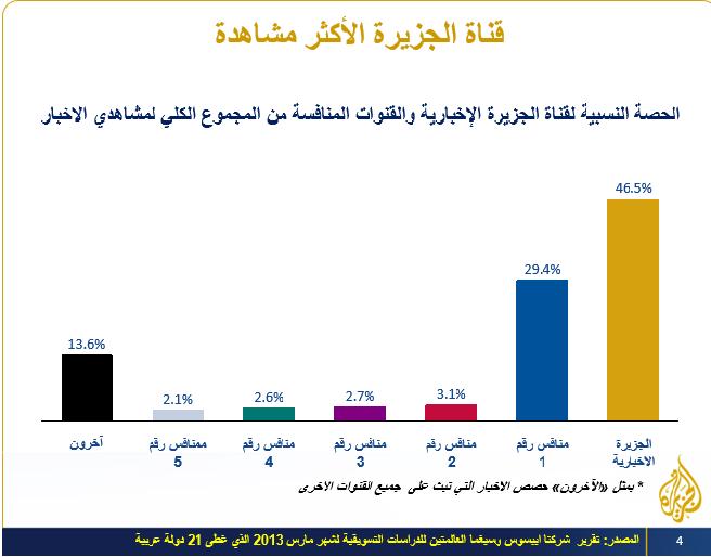 وتفوقت قناة الجزيرة خلال شهر مارس2013 بنسبة مشاهدة يومية على  القنوات الاخبارية العربية المنافسة لها، إذ وصل الفارق بين نسبة مشاهدى  الجزيرة و نسبة مشاهدى  كل القنوات  الاخبارية العربية الاخرى مجتمعة الى 34 % ، و خلال الربع الاول من هذا العام  تفوقت  الجزيرة  في العالم العربي على منافستها الاقرب  بنسبة41 % مقابل 20 % في عام 2010.