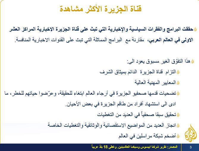 وتابع التقرير ان سر تفوق الجزيرة عائد ايضا الى تحقيقها سبقا صحفيا في العديد من التغطيات  وانجاز العديد من المواضيع الاستقصائية و الوثائقية و التغطيات الخاصة  امتلاكها لاضخم شبكة مراسلين في العالم .
