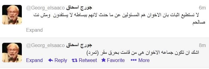وقال إسحاق في تغريده له عبر تويتر:"أشك في أن الإخوان هم من حرقوا مقر حركة تمرد بوسط البلد ".