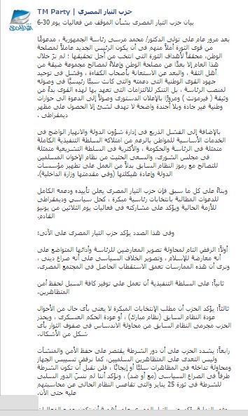 وأكد على رفض الحزب التام لمحاولة تصوير المعارضين للرئاسة على أنه معارضة للإسلام , وتصوير الخلاف السياسي على أنه صراع ديني وأن تعمل السلطة التنفيذية علي توفير كافة السبل لحفظ أمن المتظاهرين.