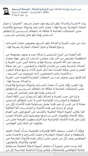 واستنكر  الحزب في بيانه حصار المسجد  الذي كان بداخله أمين "الحرية والعدالة" بكفر الشيخ وعدد من قيادات جماعة الإخوان المسلمين وبعض المصلين منذ صلاة العصر وحتى صلاة العشاء، مما أدى لمنع الآذان وأداء صلاة المغرب، مشدداً أن حرمة المساجد خط أحمر ولا بد أن تحترم قدسيتها.