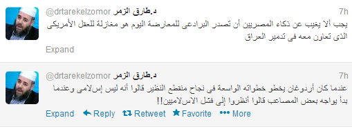 وقال الزمر – من خلال تغريده لها علي موقع التواصل الإجتماعي " تويتر " – : " عندما كان أردوغان يخطو خطواته الواسعة فى نجاح منقطع النظير قالوا أنه ليس إسلامى وعندما بدأ يواجه بعض المصاعب قالوا أنظروا إلى فشل الإسلاميين !!" .