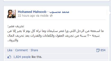 وصرح محسوب :"ما أسمعه من الرجل اللي ورا عمر سليمان وما نراه كل يوم لا يعبر إلا عن نتيجة ٣٠ سنة من تجريف العقول والكفاءات والقدرات بعد تحريف المال والثروة".