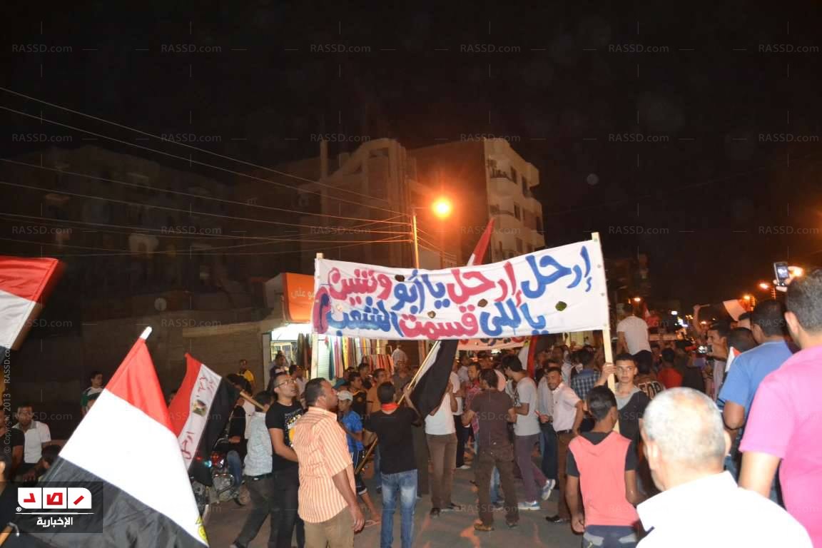 تجمع العشرات بميدان البساتين بمدينة الخارجة وانضمت إليهم المسيرة القادمة من ميدان ميتالكو ويهتفون برحيل محمد مرسي وإسقاط النظام وهيمنة الإخوان