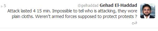 كما قال جهاد الحداد -.المتحدث باسم جماعة الاخوان المسلمين- عبر تغريدته على تويتر "هجموم استمر لمدة 14 دقيقة ومن المستحيل تحديد هوية المهاجمين فاهم يتردون ملابس عادية.. اليس على القوات المسحلة حماية المتظاهرين ؟؟"
