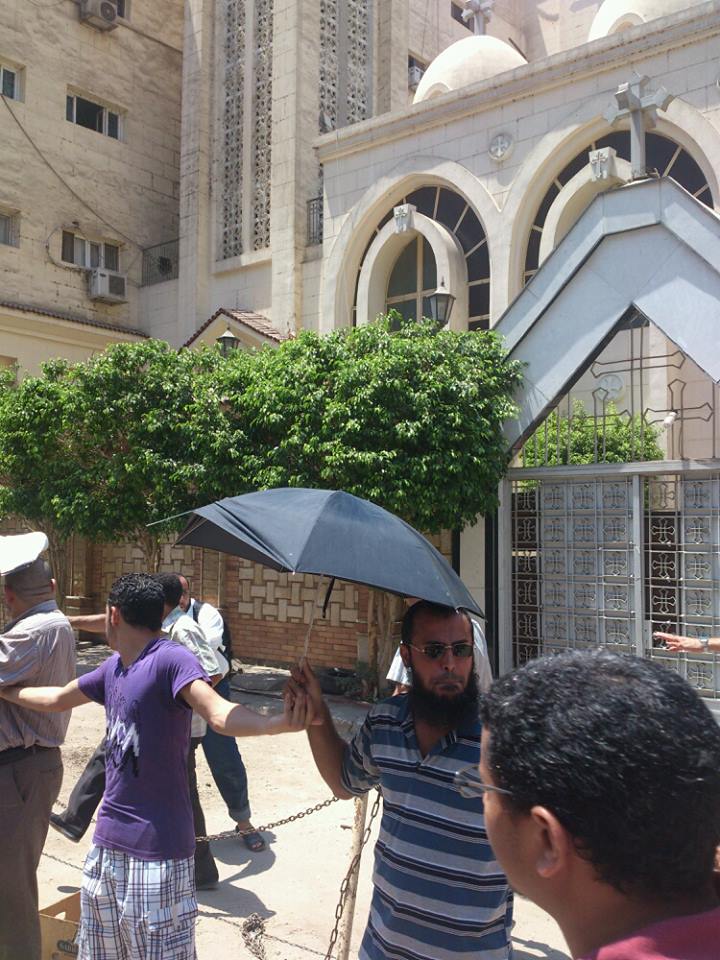 فيما شكل المتظاهرون المؤيدون للرئيسدروع بشرعية لحماية الكنيسة المقابلة لمسجد خاتم المرسلين في  محافظة الجيزة