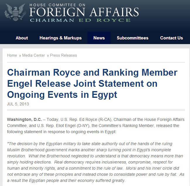 أصدرت لجنة العلاقات الخارجية بمجلس النواب الأمريكى، بيانا عن الأحداث المستمرة فى مصر، وقال النائب إدرويس، رئيس اللجنة، والنائب إليوت إنجيل، عضو اللجنة، فى بينان امس -الجمعة-: "إن قرار الجيش المصرى بإبعاد الإخوان المسلمين عن السلطة، يمثل نقطة تحول حادة فى ثورة مصر غير المكتلة، وما فشل الإخوان المسلمين في فهمه هو أن الديمقراطية لا تعنى مجرد إجراء الانتخابات، فالديمقراطية الحقيقية تتطلب الشمول والتسوية واخترتم حقوق الإنسان والأقليات، والالتزام بسيادة القانون، ولم يتبنى مرسى أو دائرته المقربة أيا من هذه المبادئ واختاروا بدلا من ذلك تعزيز السلطة والحكم بالأمر، ونتيجة لذلك عانى شعب مصر واقتصادها بشكل كبير".
