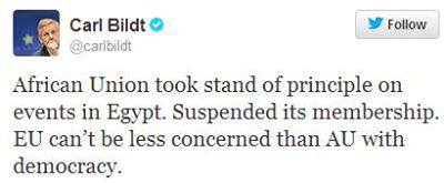 وانتقد بيلدت في تغريدة له على موقع "تويتر" اليوم الأحد ما سماه بموقف الاتحاد الأوربي تجاه الأحداث الأخيرة في مصر، وأضاف: " الاتحاد الإفريقي وقف إلى جانب المبادئ، بعد قرار تعليق العضوية، لذا لا يجب أن يكون الاتحاد الأوربي أقل اهتماما بالديمقراطية".
