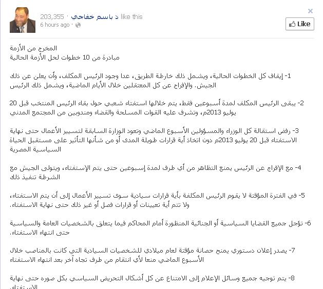 طرح الدكتور باسم خفاجى رئيس حزب التغيير و المرشح الرئاسي السابق اليوم الاحد مبادرة من عشر خطوات للخروج من الازمة الحالية التى تعاني منها مصربعد الانقلاب على شرعية الرئيس محمد مرسي .