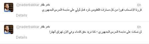وأضاف بكار ، من خلال  تغريده له علي " تويتر " : "لن نسكت على مذبحة الحرس الجمهوري ؛ كنا نريد حقن الدماء وهي الان تهراق أنهارا " .