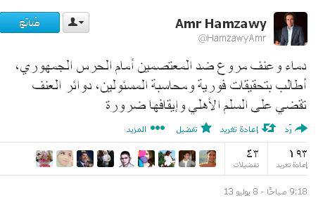 وقال حمزاوي ، عبر تويتر، " دماء وعنف مروع ضد المعتصمين أمام الحرس الجمهوري، أطالب بتحقيقات فورية ومحاسبة المسئولين، دوائر العنف تقضي على السلم الأهلي وإيقافها ضرورة".