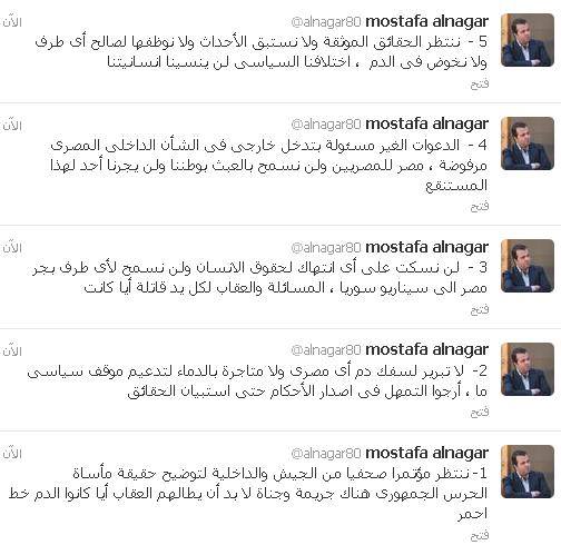 وأشار النجار إلى أنه" لن نسكت على أى انتهاك لحقوق الانسان ولن نسمح لأى طرف بجر مصر الى سيناريو سوريا ، المسائلة والعقاب لكل يد قاتلة أيا كانت".