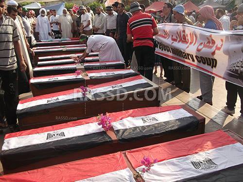 كما انطلقت منذ قليل مسيرة من ميدان رابعة العداوية بالأكفان تطوف أرجاء مدينة نصر، ذلك في الوقت التى جهزت فيه نعوش شهداء مجزرة الفجر أمام مسجد رابعة العداوية للاستعداد للدفن.