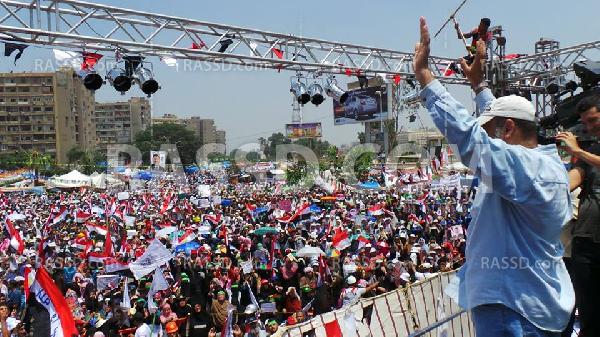 ويشارك في تظاهرات اليوم حشود المحافظات المصرية التي بدأت في التوافد على الميدان الليلة الماضية، كما وصلت مسيرة حاشدة قادمة من شارع الطيران من تجاه التأمين الصحي الى ميدان رابعة العدوية للمشاركة في مليونية الزحف.