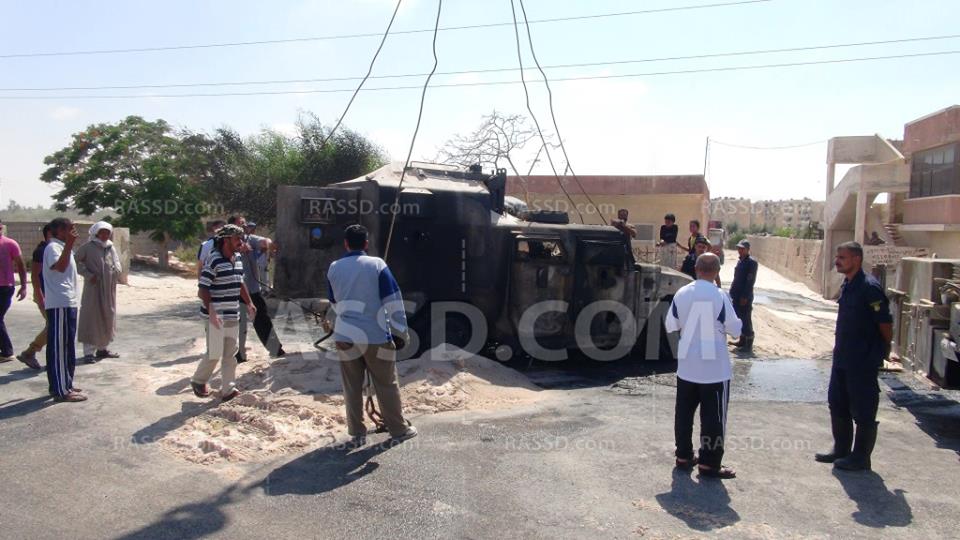 أحرقت مجموعة من الأهالي الغاضبين بالعريش ظهر اليوم(الجمعة) مدرعة الشرطة التي تعرضت للقصف فجر اليوم الجمعة احتجاجا على الانفلات الأمني الذي تشهده سيناء.