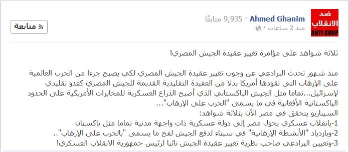 وقال غانم في تدوينته على صفحته الشخصية بموقع التواصل الاجتماعي "فيس بوك" أن هناك ثلاثة شواهد على مؤامرة تغيير عقيدة الجيش المصري!