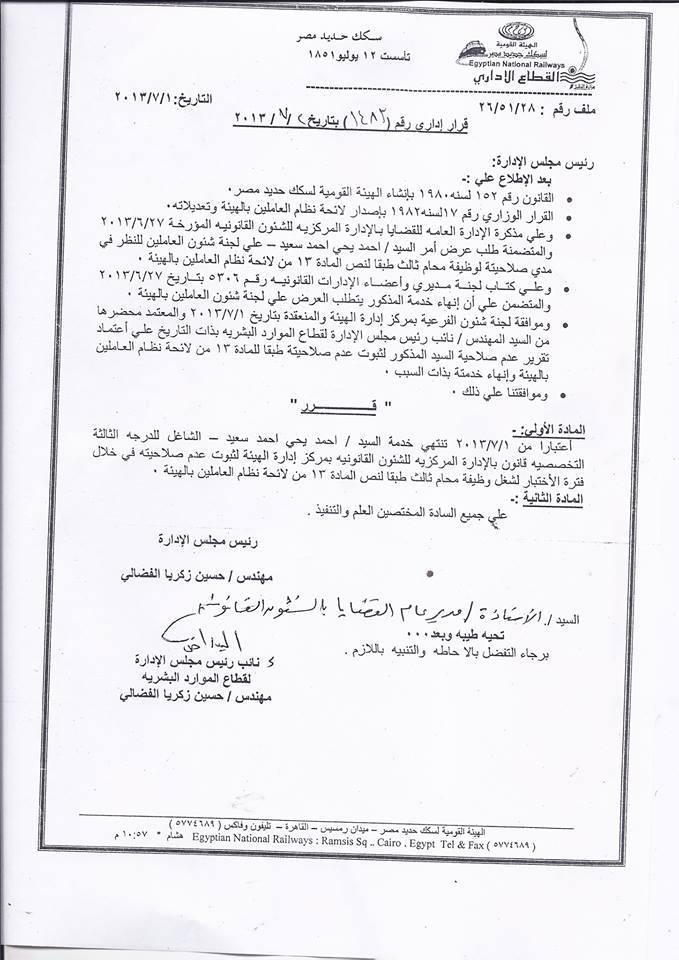 يقول عبد العزيز السيد  عبد العزيز –موظف بإدارة التسويف والمبيعات بقطاع نقل البضائع السكة الحديد أحمد كان يعمل بإدارة الشئون القانونية بهيئة السكة الحديد  وتم فصله بسبب إهماله في العمل و الشكاوي المقدمة ضده وسوء أخلاقه وتعاملع مع زملاءه  كما تم تحرير محضر الشرطة النقل المواصلات بسبب دعواته للاضراب نافيًا أن يكون سبب فصله معرضته للرئيس كما تردد في الإعلام.