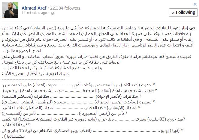 وقال في تدوينة له على صفحته على الفيس بوك منذ قليل " في إطار دعوتنا للعائلات المصرية و جماهير الشعب كله للمشاركة غداً في مليونية (كسر الانقلاب) في كافة ميادين و محافظات مصر ؛ نؤكد على ضرورة الحفاظ على المظهر الحضاري لصمود الشعب المصري الرافض لأي إذلال له أو إهانة أو سطو على السلطة ، و في أذهاننا ما كانت تقوم به أو تتستر عليه المعارضة طوال عام كامل من مولوتوف و عنف و اعتداءات على القصر الرئاسي و دار القضاء العالي و مؤسسات الدولة تحت سمع و بصر قيادات أمنية ميدانية اتضح للجميع عمالتها ".