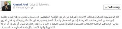 قال الدكتور أحمد عارف المتحدث باسم جماعة الإخوان المسلمين إن "الانقلابيين قاموا بالتنكيل بقيادات الإخوان و غيرهم من الرموز الوطنية المعتقلين في سجن ملحق مزرعة طرة و نقلهم إلى سجن العقرب شديد الحراسة (سئ السمعة)".
