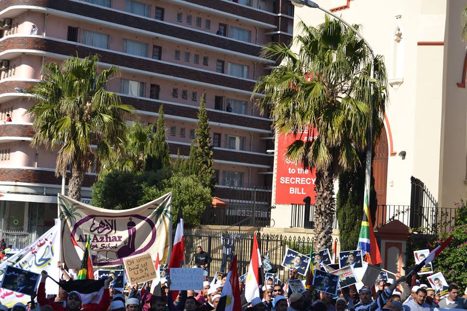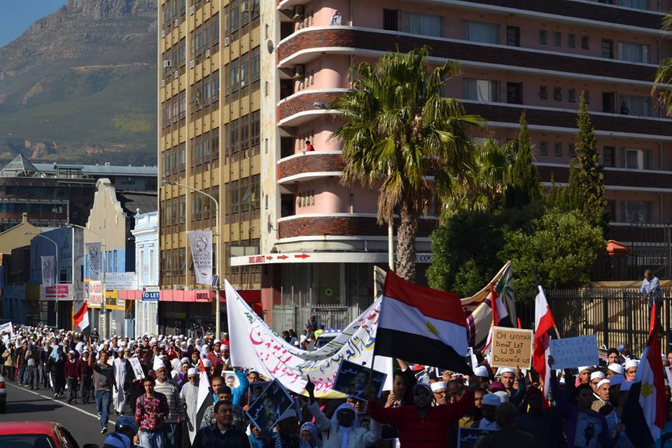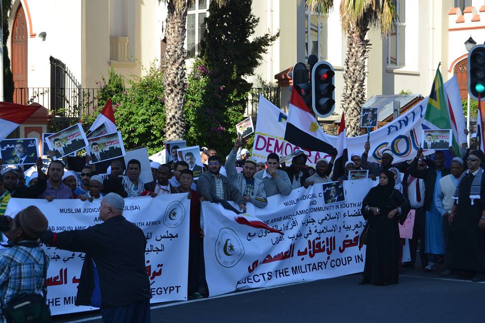 تظاهر أمس الخميس الآلاف في مدينة "كيب تاون" بجنوب أفريقيا أمام مبنى البرلمان لرفض الانقلاب العسكري في مصر وتأييدا للشرعية المنتخبة .