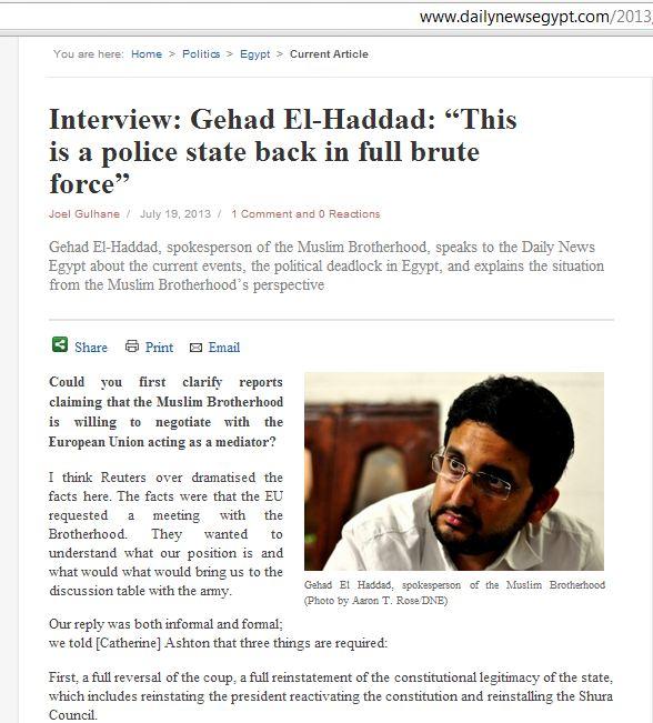 وتابع الحداد أن الإخوان أخبروا كاثرين آشتون – الممثل للشئون السياسية والأمنية بالاتحاد الأوروبى – أن هنالك ثلاثة أمور مطلوبة، أولها الانعكاس الكامل للانقلاب، والإعادة الكاملة للشرعية الدستورية والتي تتضمن عودة الرئيس وإعادة تفعيل الدستور وعودة مجلس الشورى من جديد.