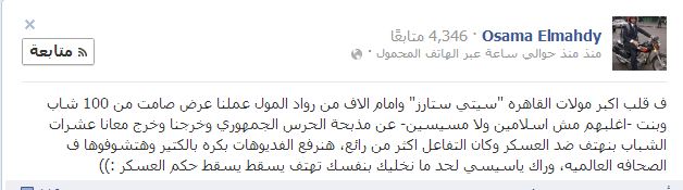 وقال أسامة المهدي – أحد المشاركين- في تدوينة له على فيس بوك " ف قلب أكبر مولات القاهره "سيتي ستارز" وأمام آلاف من رواد المول عملنا عرض صامت من 100 شاب وبنت -أغلبهم مش اسلامين ولا مسيسين- عن مذبحة الحرس الجمهوري وخرجنا وخرج معانا عشرات الشباب بنهتف ضد العسكر وكان التفاعل أكثر من رائع، هنرفع الفديوهات بكره بالكتير وهتشوفوها ف الصحافه العالميه، وراك ياسيسي لحد ما نخليك بنفسك تهتف يسقط يسقط حكم العسكر"