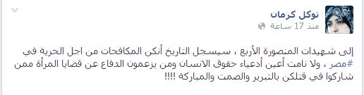 وجهت توكل كرمان -الناشطة السياسية اليمنية والحاصلة على جائزة نوبل للسلام – كلمة إلي شهيدات المنصورة الذين قتلوا أمس علي يد بلطجية أثناء خروجهم في مسيرة لرفض الانقلاب العسكري.