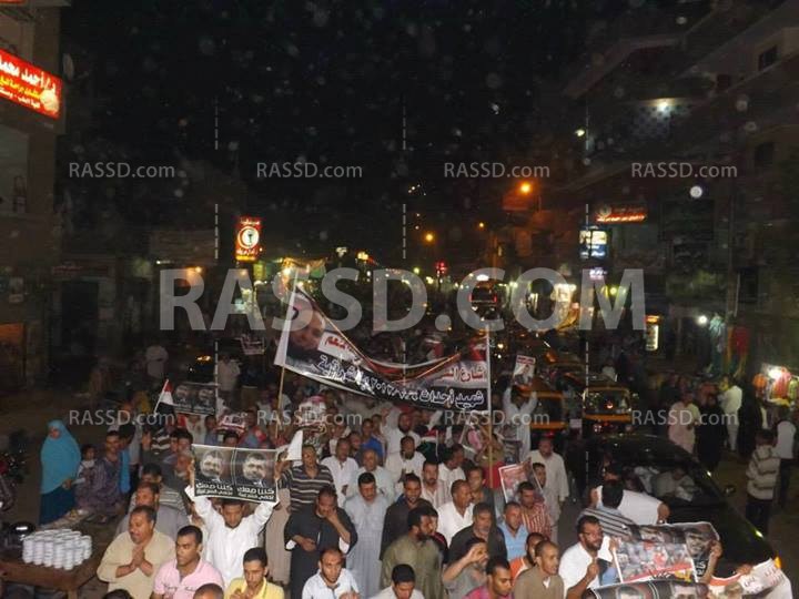 وردد المتظاهرون هتافات منددة بالانقلاب العسكري منها " يسقط يسقط حكم العسكر ؛ إحنا الشعب الخط الأحمر" ؛ "يا سيسي يا رمز العار تفرق إيه عن بشار" و"قتلوا إخوانا غدر في صلاة الفجر"، يسقط يسقط حكم العسكر" ثوار احرار هنكمل المشوار"؛ وتفاعل جمهور المدينة مع المسيرة مرددين الهتافات المؤيدة للشرعية ؛ وحمل المشاركون صورًا للرئيس محمد مرسي رئيس الجمهورية ولافتات منددة بمجزرة الساجدين والانقلاب العسكري والمطالبة بعودة الشرعية.