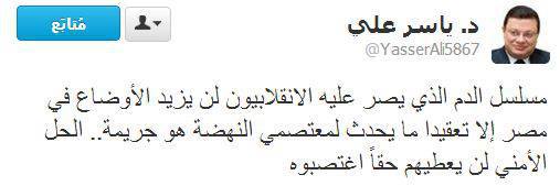 قال الدكتور ياسر على المتحدث السابق باسم رئاسة الجمهورية – عبر تويتر– أن مسلسل الدم الذي يصر عليه الانقلابيون لن يزيد الأوضاع في مصر إلا تعقيدا.
