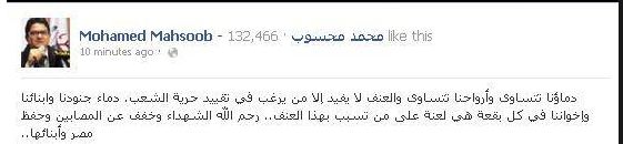 محسوب – دماؤنا تتساوى وأرواحنا تتساوى والعنف لا يفيد إلا من يرغب في تقييد حرية الشعب، دماء جنودنا وأبنائنا وإخواننا في كل بقعة هي لعنة على من تسبب بهذا العنف .. رحم الله الشهداء وخفف عن المصابين وحفظ مصر وأبنائها