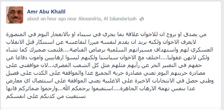 قال الدكتور عمرو أبو خليل – خبير في العلوم الاجتماعية والنفسية- اليوم الأربعاء، أنمن يصدق أو يروج أن للإخوان علاقة بما يجري في ‫ سيناء أو بالإنفجار في ‫المنصورة لايعرف ‫الإخوان ولكنه يريد أن يقدم لنفسه مبررا لتقاعسه عن استنكار قتل ‫‏الانقلاب العسكري لهم واستهداف مسيراتهم السلمية برصاص القناصة.