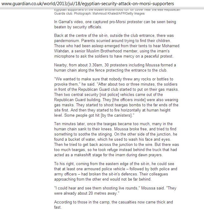 في الساعات الأولى من يوم 8 يوليو، قتلت قوات الأمن 51 من أنصار جماعة الإخوان المسلمين - بحسب ما أورته الجارديان وإن كان عدد...
