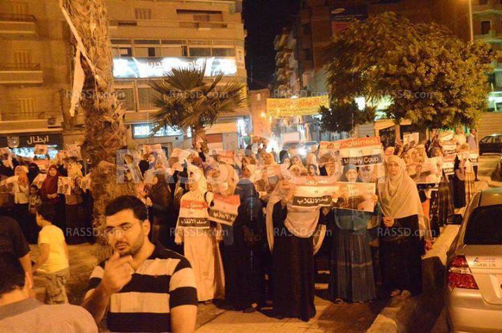 ورفع المتظاهرون صور الرئيس محمد مرسي، وعلم مصر، وصور شهداء محافظة البحيرة ، وحرائر مصر الشهيدات.، فضلًا عن لافتات تحمل عبارات منددة بحكم العسكر، وقتل النساء وانتشار البلطجة منها "لا لقتل الأطفال"، "لا لقتل النساء"، "سنظل سلميين" وانتهت المسيرة بامتداد الشارع أمام كوبري أبوالريش والذي يعد من أطول الشوارع الحي المكتظة بالجماهير، وسط تضامن كبير من المارة.