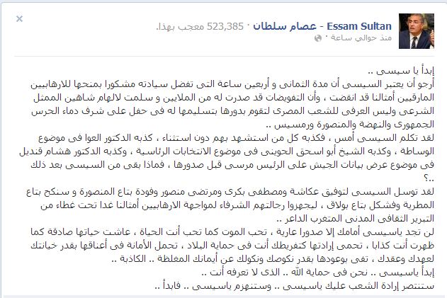 وقال في تدوينة له منذ قليل على صفحته بموقع التواصل الاجتماعي -فيس بوك- " لقد توسل السيسى لتوفيق عكاشة ومصطفى بكرى ومرتضى منصور وفودة بتاع المنصورة و سنكح بتاع المطرية وفشكل بتاع بولاق ، ليجهزوا رجالتهم الشرفاء لمواجهة الارهابيين أمثالنا غدا تحت غطاء من التبرير الثقافى المدنى المتغرب الداعر .. "