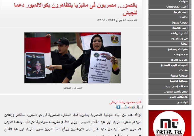 نشرت اليوم السابع خبر ،أمس الجمعة، أدعت فيه أن ابناء الجالية المصرية في ماليزيا تظاهروا أمام السفارة المصرية بماليزيا لتأييد السيسي، في حين نفي مراسلنا من العاصمة كوالامبور ذلك وارسل لنا صور توضح خروج المصريين والماليزيين لرفض الانقلاب العسكري ودعم شرعية الرئيس مرسي في وقفة لهم أمام السفارة بعد صلاة الجمعة.