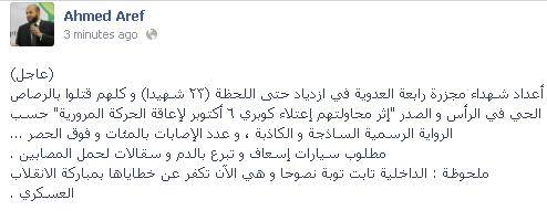 وأضاف عارف على صفحته الشخصية على موقع التواصل الاجتماعي" فيس بوك": أن كلهم قتلوا بالرصاص الحي في الرأس و الصدر "إثر محاولتهم إعتلاء كوبري ٦ أكتوبر لإعاقة الحركة المرورية" حسب الرواية الرسمية الساذجة و الكاذبة ، و عدد الإصابات بالمئات و فوق الحصر.