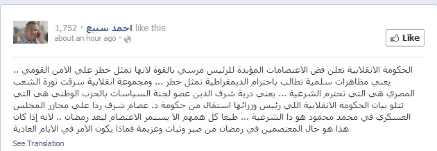 وتابع سبيع، عبر صفحته علي موقع التواصل الإجتماعي "فيس بوك" أن مجموعة انقلابية سرقت ثورة الشعب المصري هي التي تحترم الشرعية، مضيفا " يعني درية شرف الدين عضو لجنة السياسات بالحزب الوطني هي التي تتلو بيان الحكومة الانقلابية اللي رئيس وزرائها استقال من حكومة د. عصام شرف ردا علي مجازر المجلس العسكري في محمد محمود هو دا الشرعية".