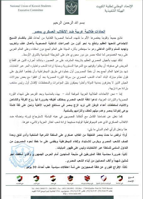ونناشد كافة الاتحادات والمنظمات الطلابية في العالم باتخاذ موقف رافض للانقلاب على الشرعية بجمهورية مصر العربية تأكيداً لمبادئ الديمقراطية وآليات التغيير المتحضرة عبر تعبير الشعوب عن إرادتها في عملية انتخابية وليس بانحياز المؤسسات العسكرية لفصيل دون آخر وفرض التغيير بالقوة والإجراءات القسرية.