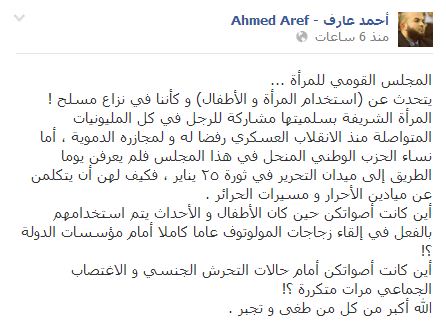 وتابع عارف في تدوينة له على صفحته الرسمية على موقع الفيسبوك اليوم "أن المرأة الشريفة بسلميتها مشاركة للرجل في كل المليونيات المتواصلة منذ الانقلاب العسكري رفضا للانقلاب ولمجازره الدموية، أما نساء الحزب الوطني المنحل في هذا المجلس فلم يعرفن يوما الطريق إلى ميدان التحرير في ثورة ٢٥ يناير ، فكيف لهن أن يتكلمن عن ميادين الأحرار ومسيرات الحرائر" .