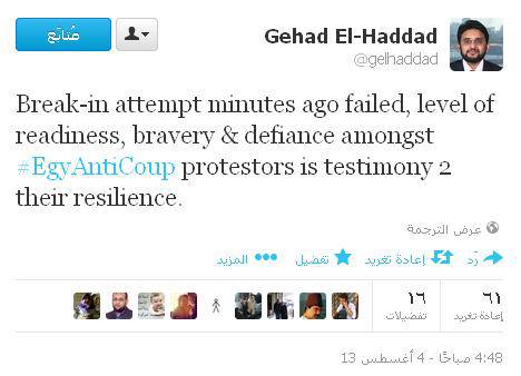 قال جهاد الحداد –المتحدث الإعلامي بإسم جماعة الإخوان المسلمين- منذ قليل، أنمحاولة فض الاعتصام فشلت منذ دقائق.