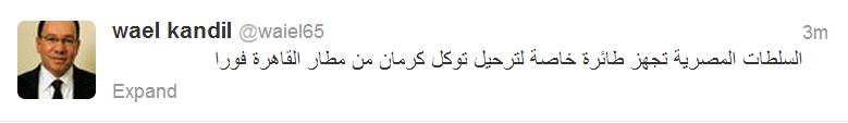 قال الكاتب الصحفي وائل قنديل في حسابه على "تويتر" إن السلطات المصرية تجهز حاليا طائرة خاصة لترحيل توكل كرمان من مطار القاهرة فورا.