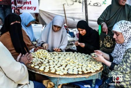 كتبت عبارات الهتافات التي يرددها المعتصمون بالكعك في "الصواني والصاجات" المعدّة لخبيز الكعك"يسقط يسقط حكم العسكر" و"حكم العسكر تاني صعب إحنا السلطة واحنا الشعب "و" الكعك مع العيدية ، ورئيسنا مع الشرعية "و"ارحل يا سيسي".