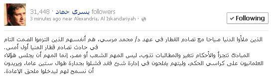 وأضاف عبر تدوينته على موقع التواصل الاجتماعي "فيس بوك" : "المبادئ تتجزأ والأحكام تتغير والمطالبات تذوب، ليس المهم الشعب أو مصر، إنما المهم أن يجلس هؤلاء العلمانيون على كراسي الحكم، وليتهم يفلحون في إدارة شئ فقد فشلوا بجدارة طوال ستين عاما، ويريدون أن نسمح لهم ليدخلوا ملحق الإعادة"