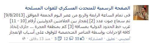 وقال في تدوينة له على صفحته الرسمية على الفيس بوك أنه "فى تمام الساعة الرابعة والربع من عصر اليوم الجمعة الموافق [9/8/2013] تم سماع صوت عدد [2] إنفجار بين العلامتين الدوليتين أرقام [10 – 11] غرب خط الحدود الدولية بمسافة [3] كم بمنطقة العجرة … جارى إتخاذ كافة الإجراءات بواسطة العناصر المتخصصة للوقوف على أسباب الإنفجار"